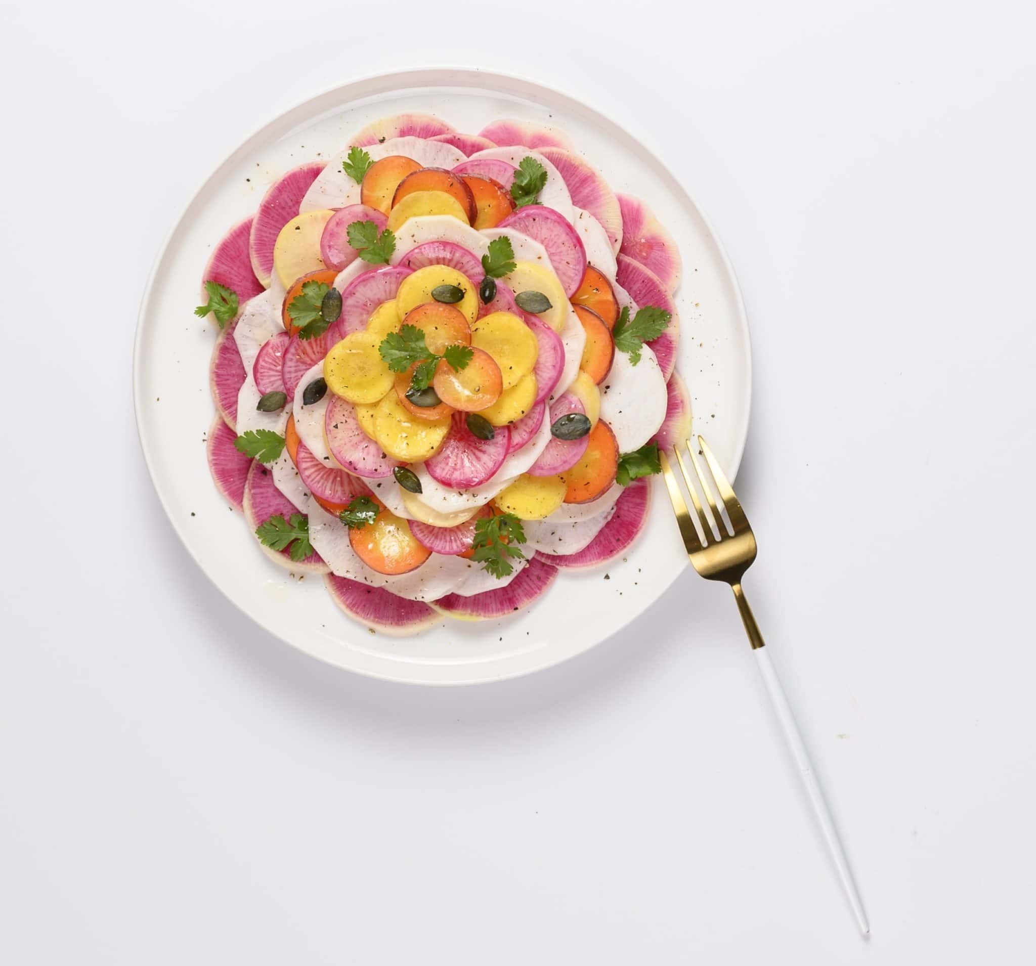 4. Arrange the vegetable slices on a large dish, alternating colours to form a harmonious rosette. Drizzle with a few drops of vinaigrette, grate a little ginger and add a pinch of salt and a turn of the pepper mill.