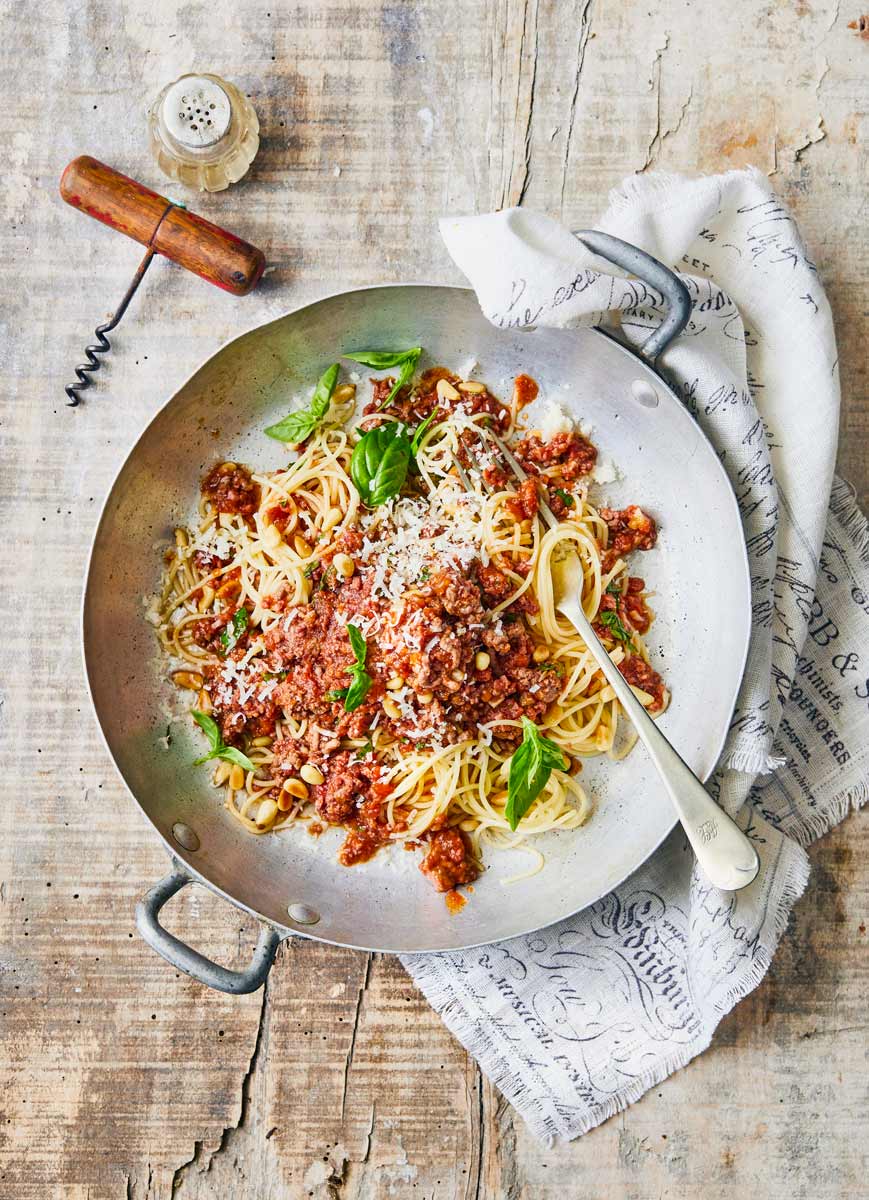 5. Égoutter les pâtes et les répartir dans des bols de service, puis les recouvrir de sauce. Parsemer de pignons de pin, de quelques feuilles de basilic et servir avec du parmesan fraîchement râpé.