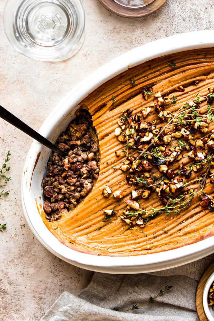 - Préchauffer le four à 200 °C. Tasser la farce de lentilles dans un plat à gratin.