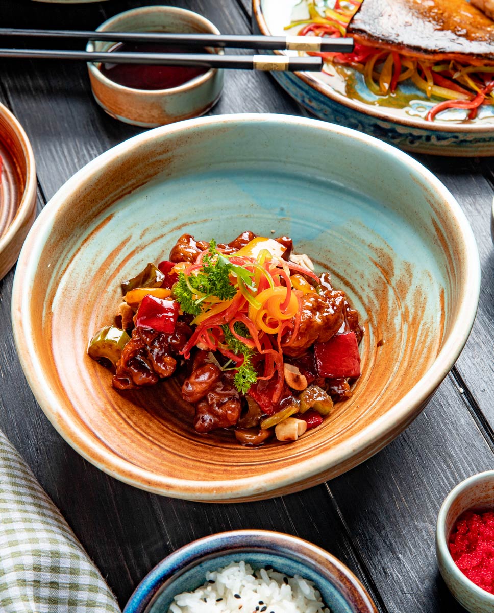 - Remettre le wok sur le feu, laisser réchauffer et ajouter l'ananas, les poivrons, le piment et les morceaux de porc. Bien mélanger et laisser cuire à feu doux durant 20 minutes.