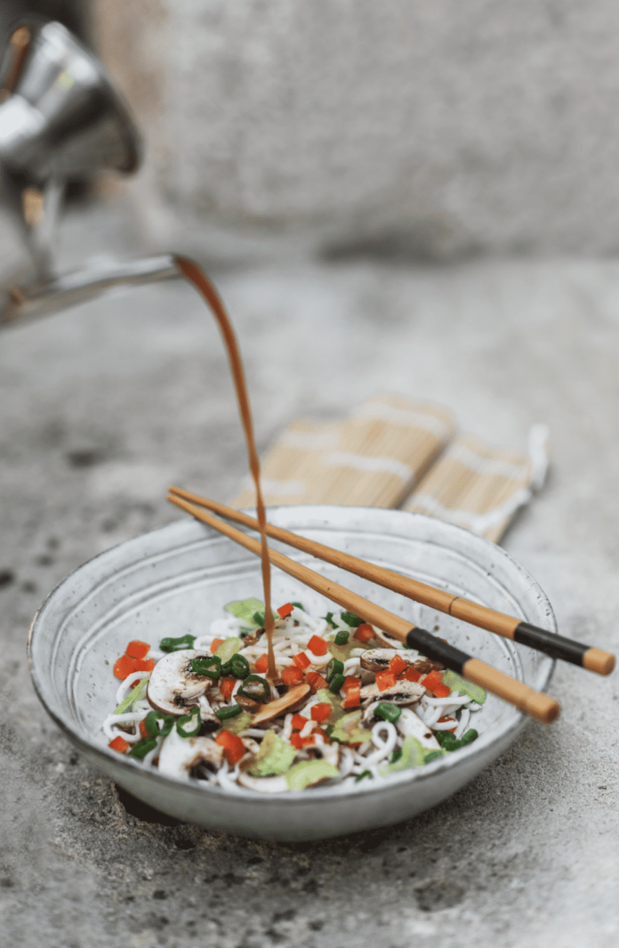 4. Rincer les nouilles à  l'eau chaude, les placer dans une assiette creuse. Parsemer dessus les différents légu- mes et verser le bouillon trÚs chaud sur le tout. Mettre un tour de moulin à  poivre.