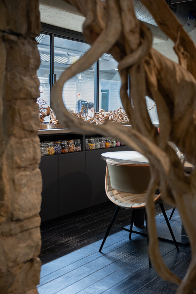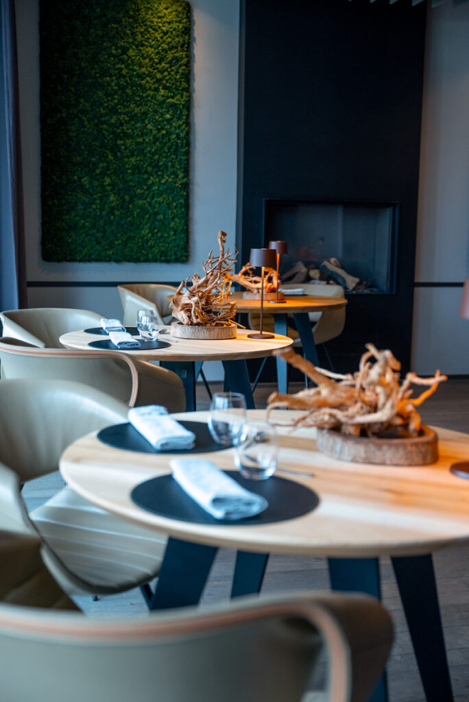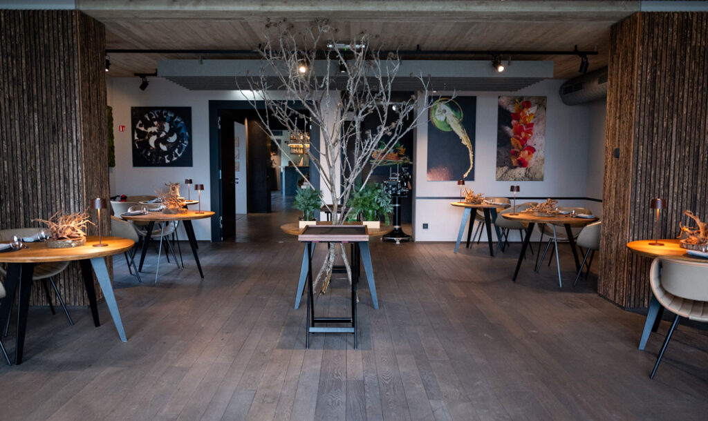 Dans ce nouvel espace de travail, le chef a souhaité une décoration simple, toujours dans une approche durable. « J’ai voulu une salle très épurée, où l’on se sente à l’aise et où on respire. La salle principale est deux fois plus grande qu’au château, avec seulement 2 couverts en plus, un superbe nouvel espace pour nous ! » s’exclame-t-il.