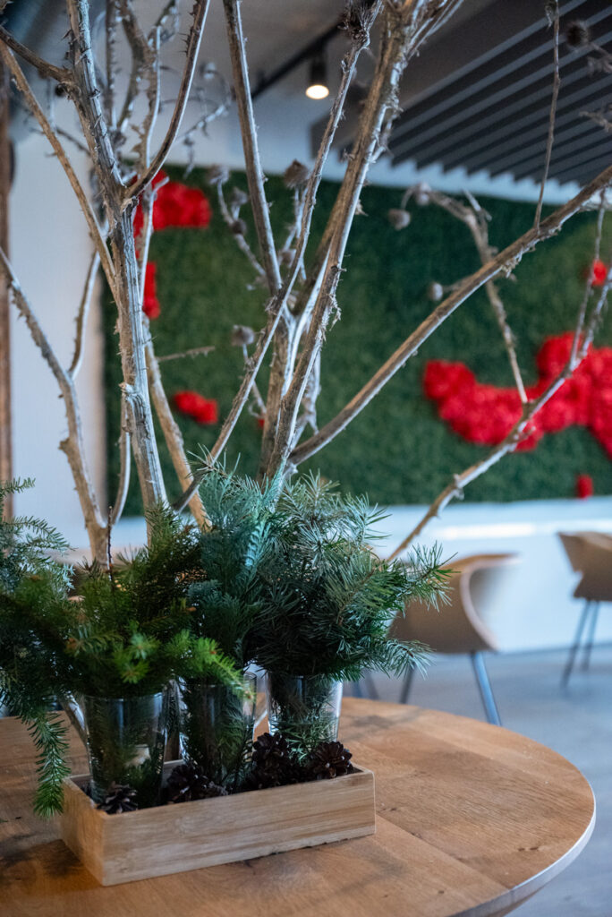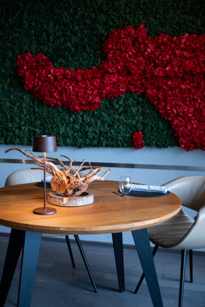 « Je voulais végétaliser l’endroit mais pas dans un style rococo comme on peut voir partout ! » s’exclame le chef. Mission réussie avec une salle dans les tons beige avec un parquet en bois noir pour un rendu extrêmement chaleureux. Le côté végétal est rappelé sur les murs avec des photos représentant des plats, mais aussi des cadres en mousse « qu’on doit vaporiser d’eau tous les jours ! », ainsi que des écorces de bois à certains endroits.