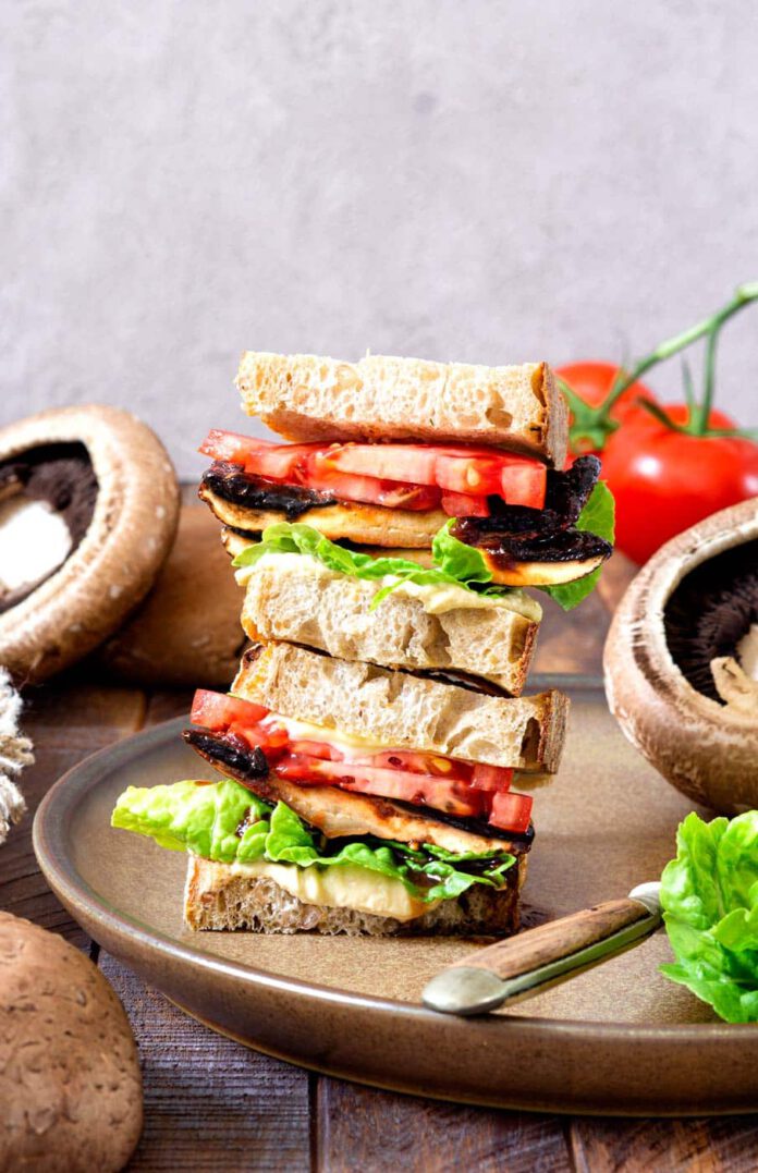 - Entre temps, faire griller le pain. Tartiner une tranche avec le houmous et l'autre avec la mayonnaise à  l'ail. Pour monter le sandwich, placer la salade, les tomates coupées en tranches et les champignons Portobello grillés sur une tranche de pain et recouvrir avec la deuxième tranche. Répéter l'opération pour le deuxième sandwich.