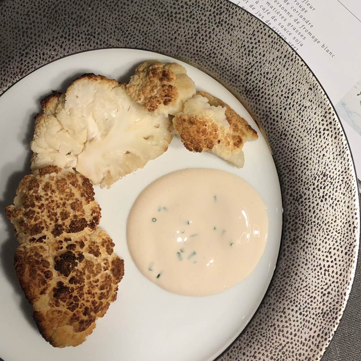 - Peler et hùcher l'oignon rouge. Laver et hùcher la coriandre, puis mélanger avec le curcuma, poivre et sel, sauce soja, jus de citron vert et le fromage blanc. Dresser le chou-fleur dans des assiettes, puis ajouter la sauce et déguster.