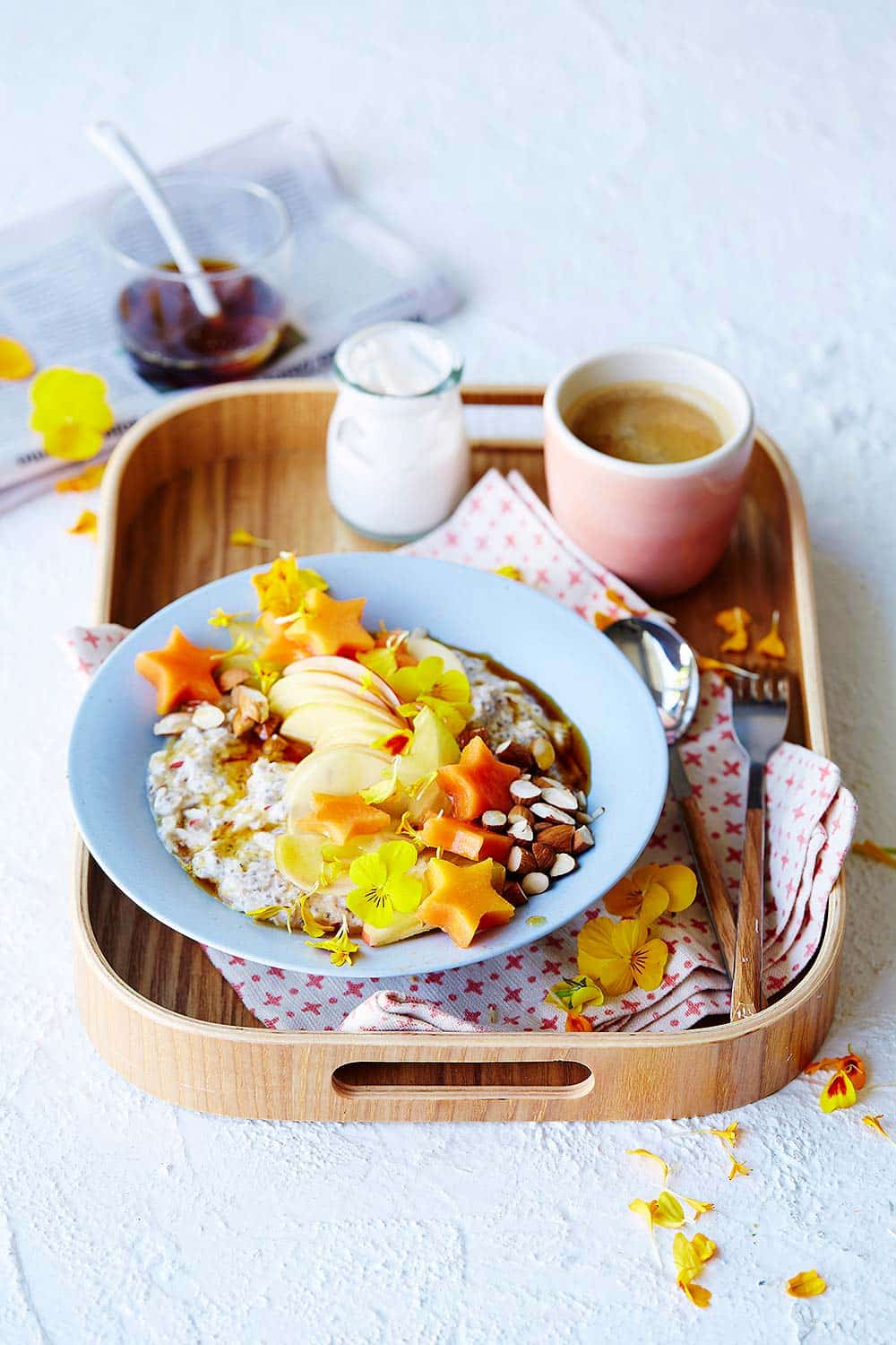 3. Vor dem Servieren Ahornsirup über das Bircher Müsli träufeln; mit Apfelscheiben, Papaya, Mandeln und essbaren Blüten garnieren. Das Bircher Müsli hält sich zugedeckt 2 Tage im Kühlschrank.