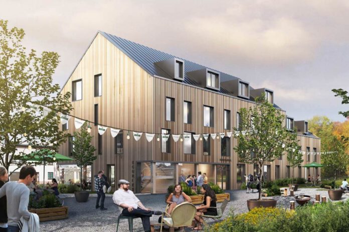 „De Brauhotel“ wurde am Mittwoch, den 23. Februar, während einer Pressekonferenz anlässlich des Auftakts der Feierlichkeiten zu Esch2022 – Kulturhauptstadt Europas in der Gemeinde Kaerjeng vorgestellt. Das vom Architekturbüro BALLINIPITT entworfene Gebäude ist an seiner Fassade aus Terrakottastreifen zu erkennen, einer Mischung aus Modernität und traditionelleren, strukturierten Materialien.