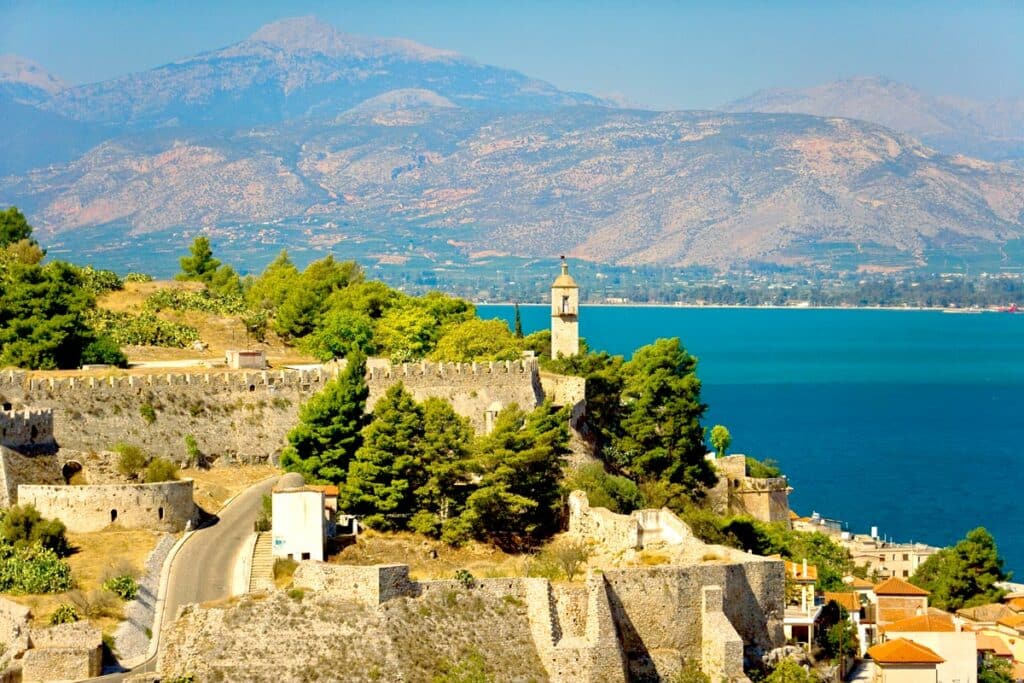Überragt wird Nauplia von zwei Burganlagen: Von der 900 Meter langen und 400 Meter breiten Festung Akronáfplio existieren lediglich noch Mauern und Bastionen aus hellenistischer, byzantinischer, fränkischer, venezianischer und osmanischer Zeit. Beeindruckender ist die Palmidis-Festung von 1687. Die Burganlage mit ihren acht Türmen thront auf einem 216 Meter hohen Hügel hoch über der Stadt und ist über 850 Stufen zu erreichen. Doch der schweißtreibende Aufstieg lohnt sich. Bietet sich doch von der venezianischen Festung ein herrlicher Blick auf Nauplia, den Argolischen Golf und bei klarer Sicht sogar auf das