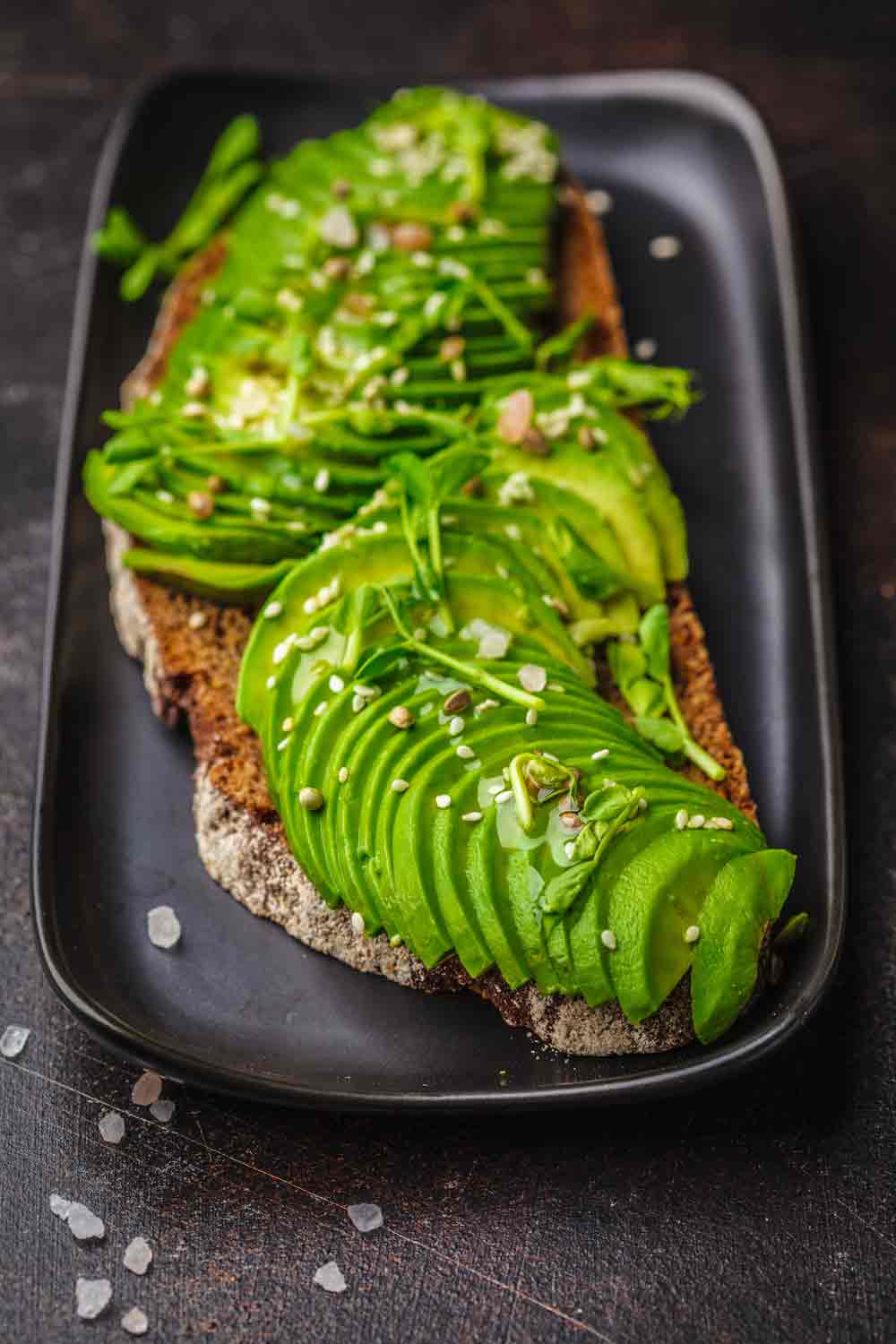 3. Disposez les tranches d'avocat sur le pain et arrosez chaque tranche de pain avec 1 cuillère à  soupe d'huile d'olive. Assaisonnez généreusement avec du poivre moulu, de la fleur de sel et un peu de zeste de citron râpé.