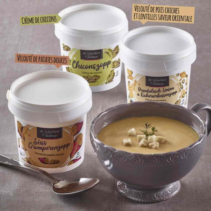 In addition to its range of soups with more classic recipes, such as tomato soup with rice, cream of pumpkin or Bouneschlupp, « De Schnékert Traiteur » has just launched a vegetarian range. Indeed, these are home-made with quality ingredients and based on trendy recipes, 3 vegetarian varieties are part of the caterer’s desire to combine the traditional with the current trends. Oriental-flavoured chickpea and lentil velouté, endive cream and sweet potato velouté will now be available for soup lovers.