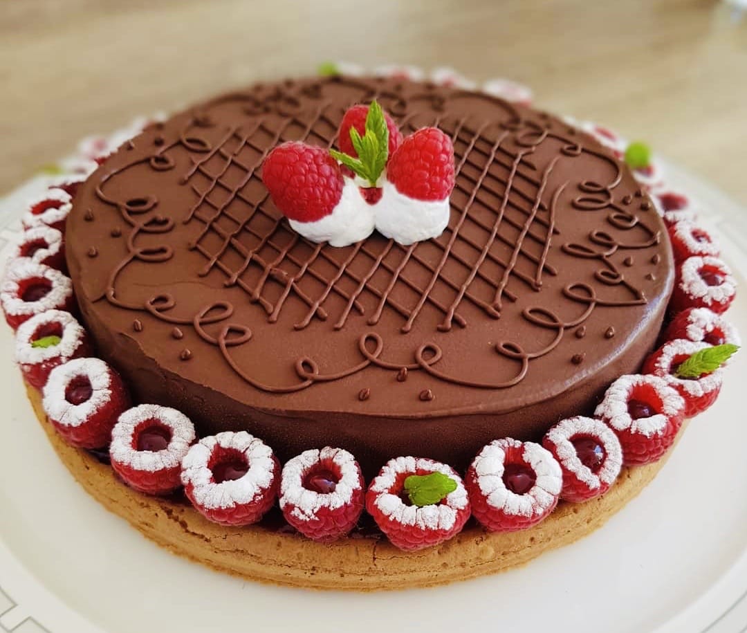 2. Ajoutez la mousse givrée au milieu et placez les framboises fraîches autour de la mousse.