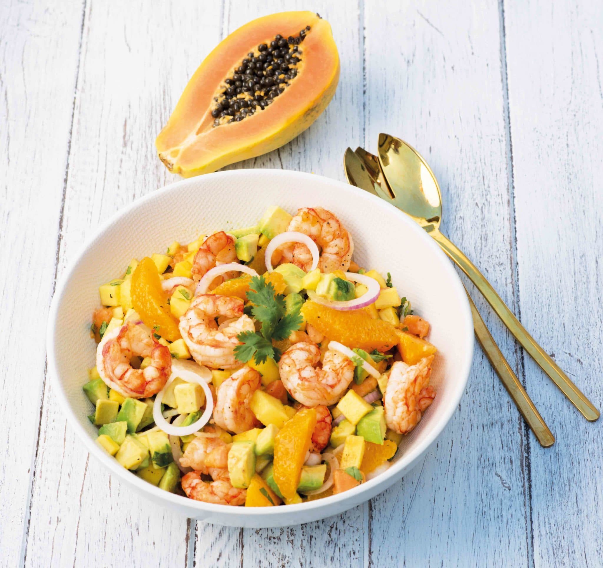 3. Epluchez et coupez en dés la mangue et la papaye, hachez finement le piment et la coriandre.