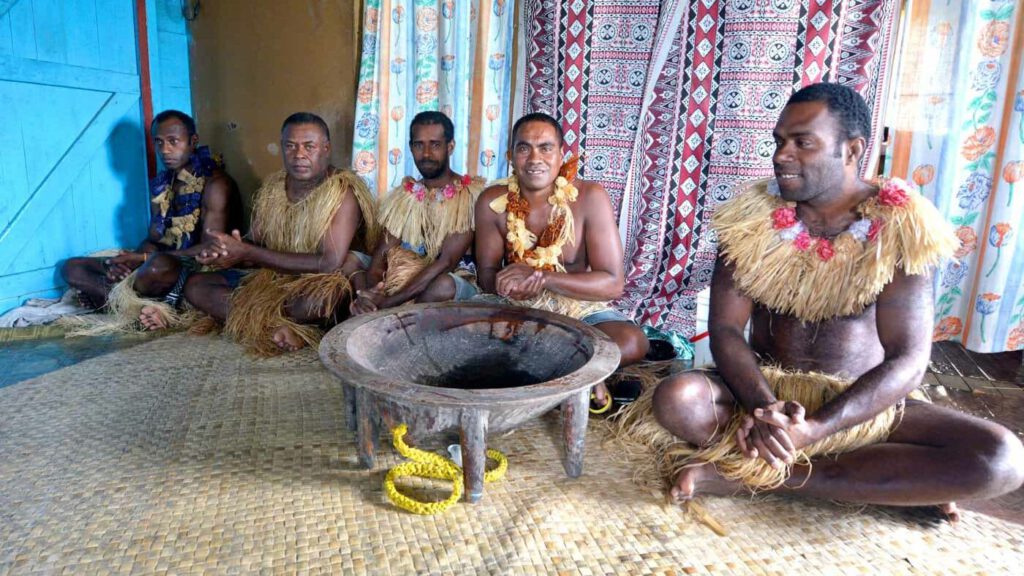 Toute personne entrant dans cette habitation doit revêtir le « sulu », la tenue nationale composée d’une jupe drapée en coton épais. Devant le « tanoa » (bol en bois utilisé pour boire le kava), une cordelette tressée en « magimari » (fibres de coco) est déposée à la place du chef. Des villageois, dont certains arborent des tatouages traditionnels, sont assis dans la pièce. Le kava est pressé à l’aide d’une botte de raphia. Une personne verse de l’eau tiède sur les racines de kava broyées.