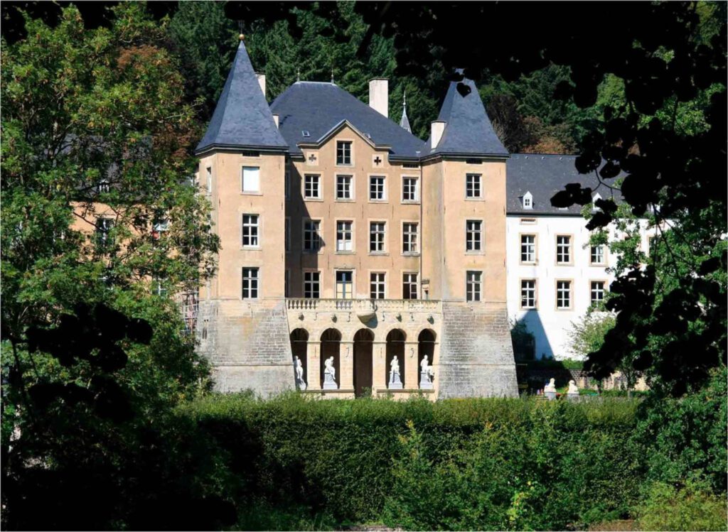 En réalité, c’est un certain Jean de Raville qui épousa Marguerite, la fille du comte d’Ansembourg au XIVe siècle. Selon les livres d’histoire, la forge de Thomas Bidart ne fut réellement construite qu’au XVIIe siècle. Ansembourg passa ensuite entre plusieurs mains pour finalement être achetée par la famille Marchant anoblie, qui construisit le château afin d’en faire une résidence digne de son rang. Le château est un palais de style baroque doté d’une superbe porte d’entrée, ornée des armoiries de la famille. L’intérieur ne se visite pas, mais les jardins constituent à eux seuls l’attraction la plus fascinante du domaine. Une fois passé le portail en fer forgé, le visiteur est comme transporté dans le parc d’une villa de Toscane. Créé au XVIIIe siècle par Lambert-Joseph de Marchant, le paysage en terrasses est encadré de pelouses symétriques et de buissons de buis aux formes géométriques. Deux sombres étangs miroirs qui reflètent le ciel viennent interrompre la deuxième terrasse verdoyante, dont la structure rappelle un Versailles miniature. Plus en contrebas se trouvent de hautes haies qui forment un labyrinthe ombragé. Le clapotis des fontaines offre un agréable fond musical. À l’extrémité du jardin commence un long sentier qui mène au bord de l’Eisch et au-dessus duquel les arbres forment un arceau. L’Allée mythologique, un chemin herbeux bordé de statues antiques grecques et romaines, dont Bacchus, Vénus et Hercule, et gardé par un sphinx à chaque extrémité, mène du bâtiment principal aux jardins. Les statues ont l’aspect du marbre de Carrare, mais sont en réalité composées de pierre blanchie à la chaux. Comme le château lui-même, le jardin a été conçu pour affermir la réputation de ses propriétaires.