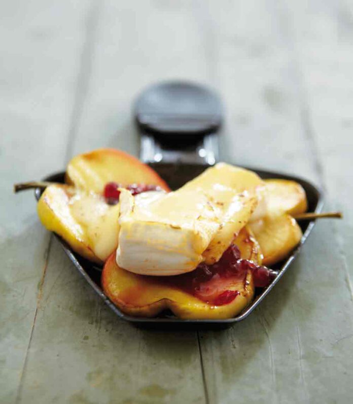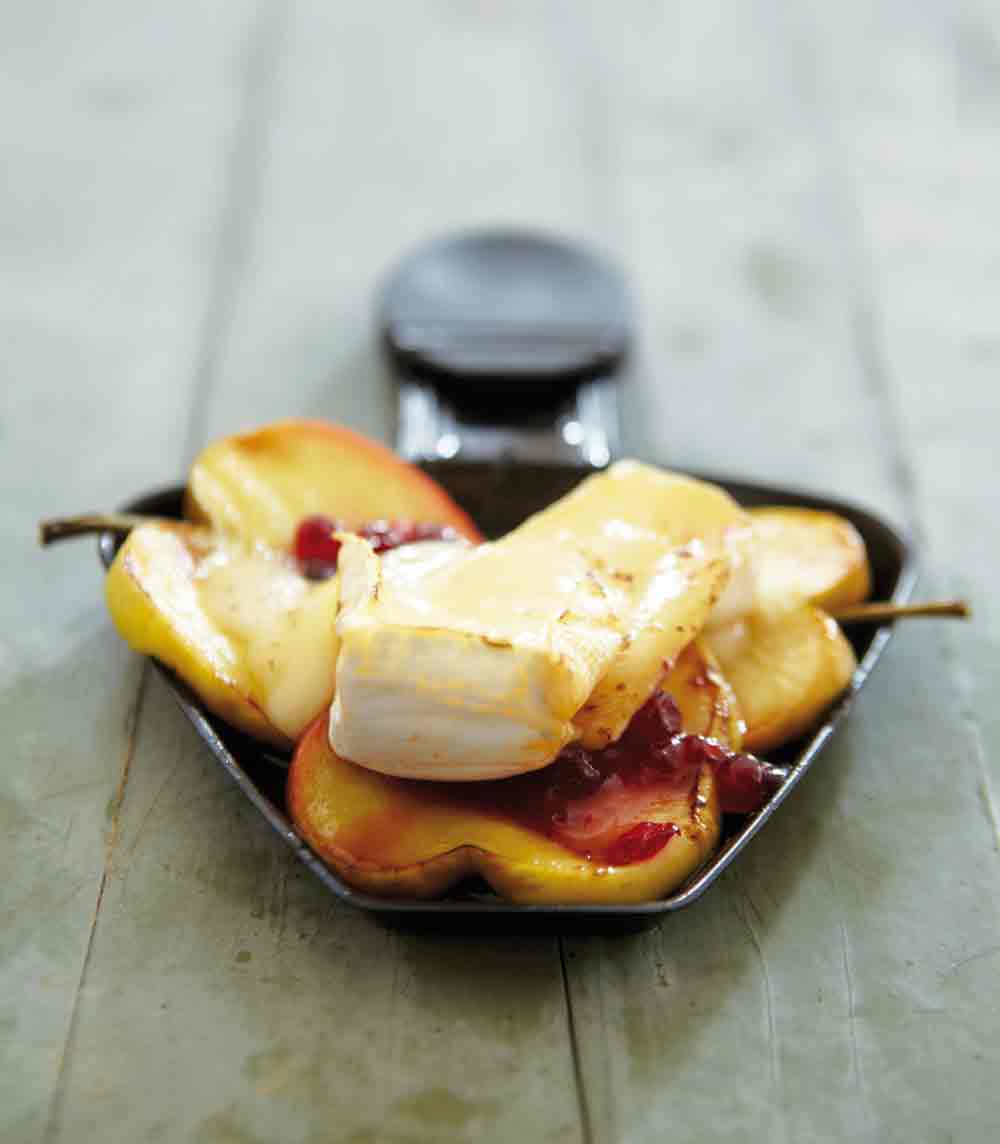 2. Couper le fromage en tranches. Mettre dans une poêlon quelques tranches de poires, de la compote d'airelles et une tranche de camembert et gratiner sous le grill à raclette.