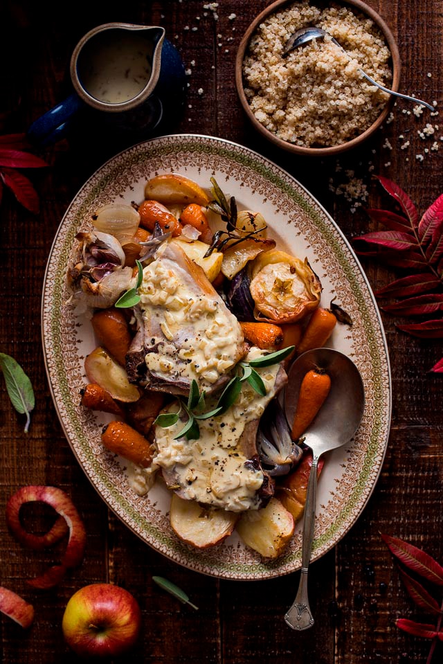 - Servir le porc avec les pommes et légumes rôtis, la sauce et le quinoa.