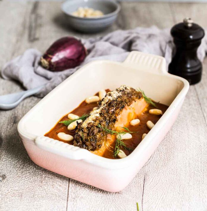 1. Mettre dans un plat allant au four, le coulis de tomates, poser le saumon sur le dessus.