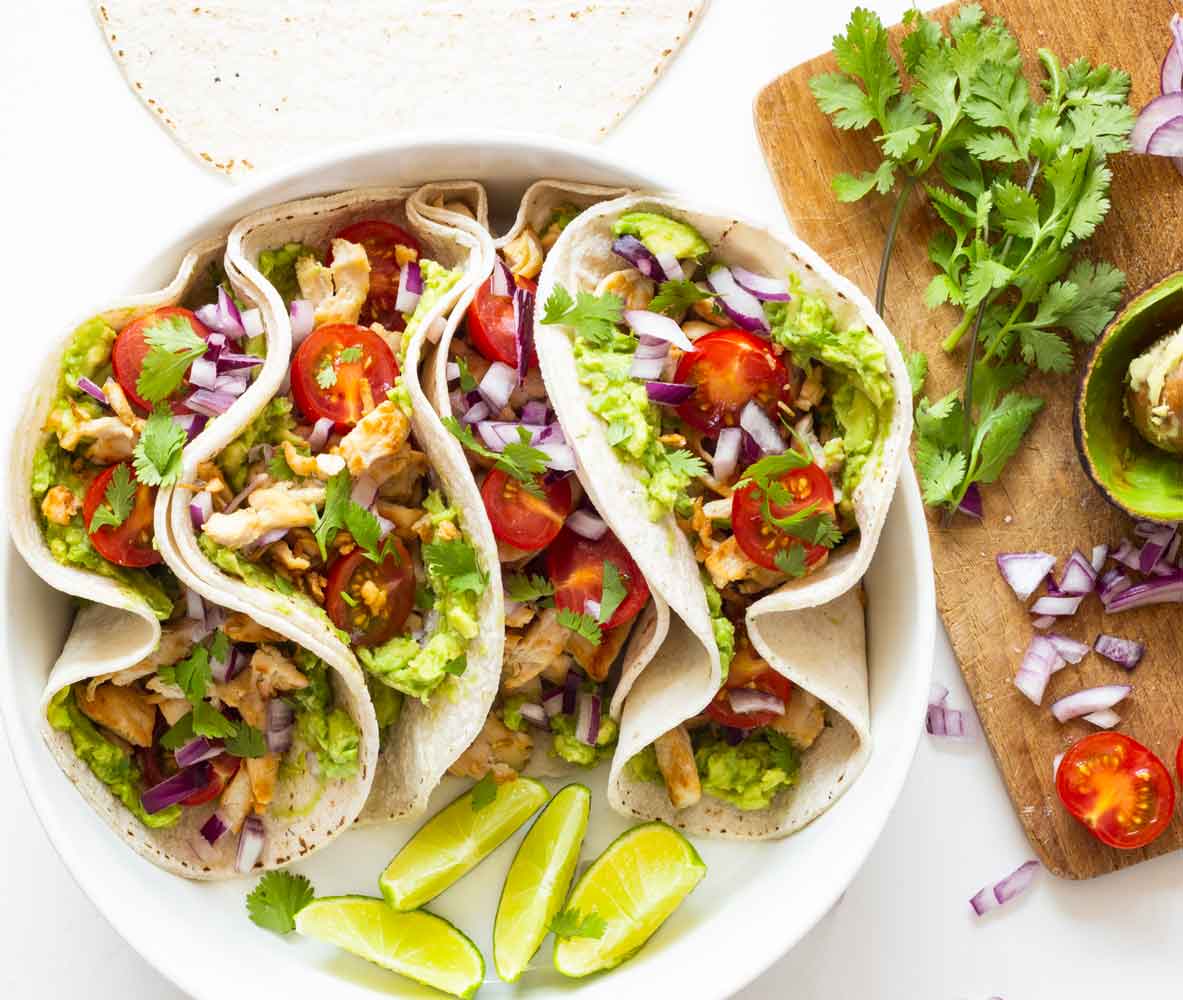 8. Ătaler le guacamole sur les tacos, ajouter de la viande, des tomates cerises, des rondelles d'oignon et de la coriandre. Servir avec des tranches de citron vert.
