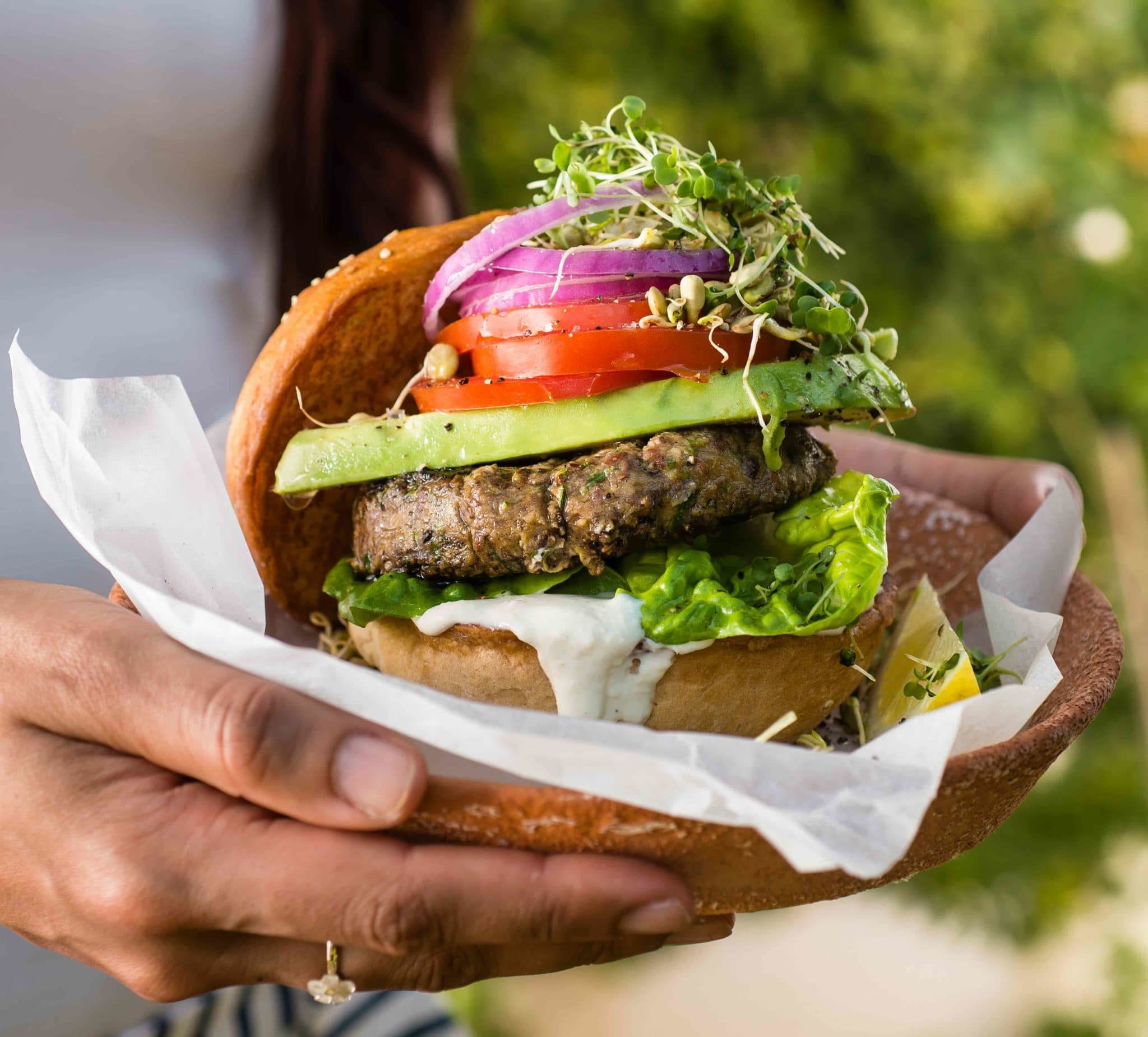 5. Pour assembler les burgers, placer une cuillerée de mayonnaise sur chaque moitié de pain à  hamburger. Garnir avec de la laitue, une galette, des tranches d'avocat, des tranches de tomate, des tranches d'oignon rouge et des germes. Fermer les hamburgers et servir avec des quartiers de citron pour les presser.