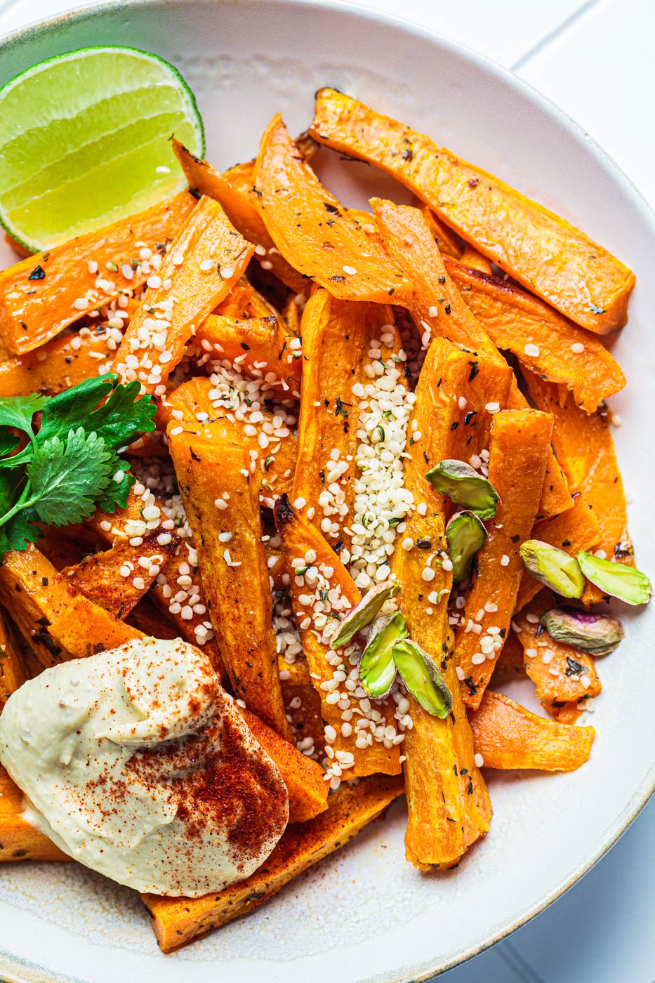 Gebackene Süßkartoffelspalten mit Hummus, Nüssen und Hanfsamen