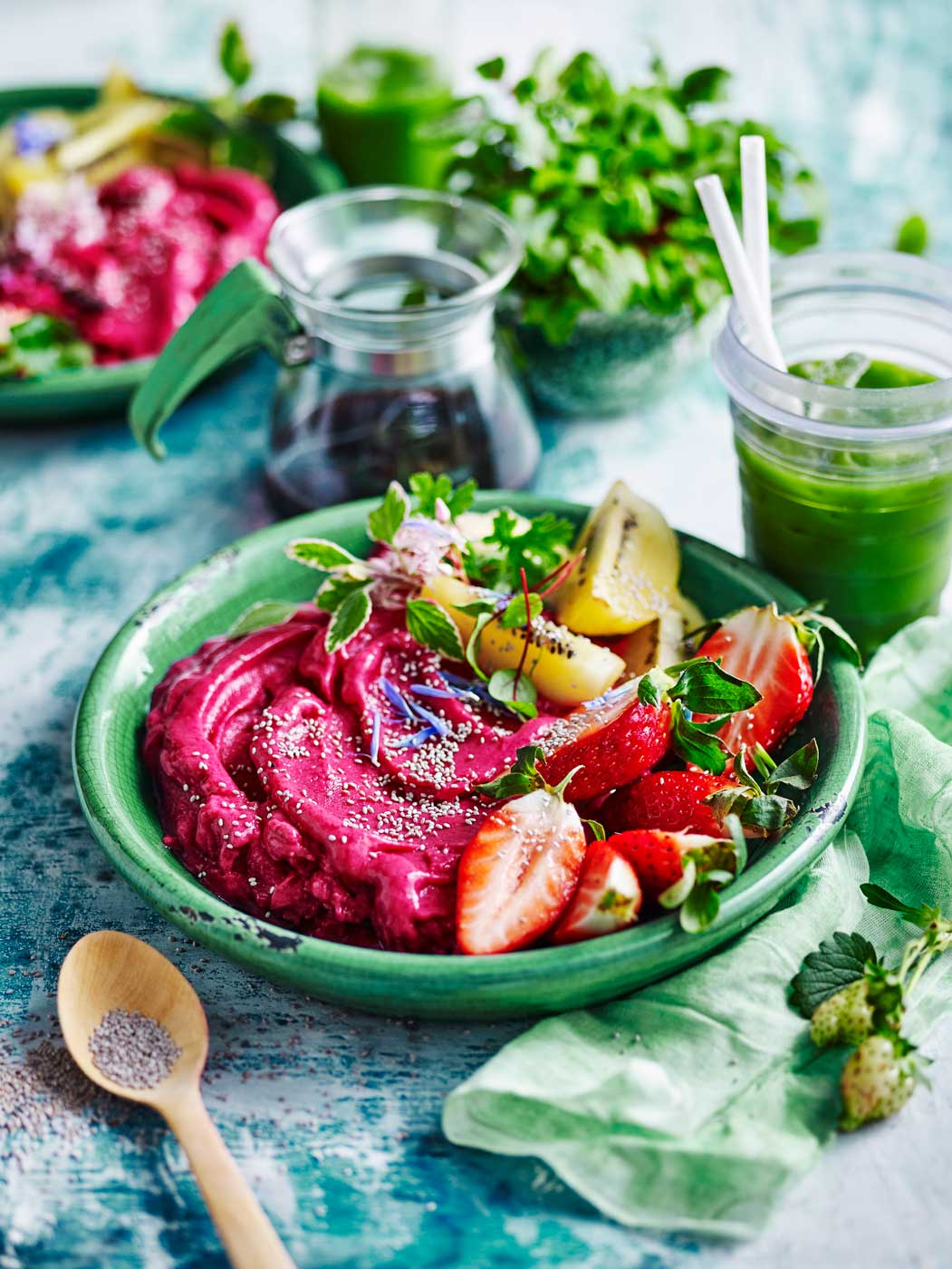 4. Die Creme in eine Schüssel geben und mit frischen Kiwis, Erdbeeren und Minzeblättern garnieren.