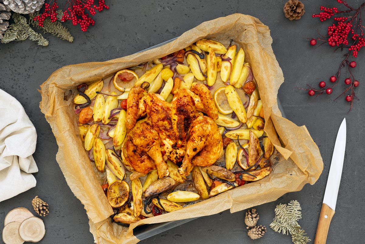 5. Auf einem Backblech zuerst die Kartoffelspalten und die Zwiebel verteilen, dann die Kirschtomaten und die Zitronenscheiben darauflegen und schließlich das Hähnchen mit der Brustseite nach oben darauflegen. Etwa 45 Minuten im Ofen garen, zwischendurch das Gemüse umrühren und etwas Saft über das Huhn gießen.