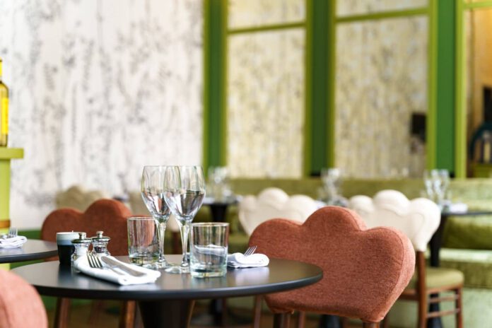 Dank der großen Fenster mit Blick auf die Straße wird Ihre Gourmetpause von der Sonne umhüllt. Die von STIL Interiors and Events entworfene Dekoration mit bequemen runden Ledersesseln und Samtstühlen mit wolkenförmigen Rückenlehnen lädt zum Entspannen und Träumen ein. Auf der Restaurant-Seite betreten wir eine sehr natürliche und gemütliche Atmosphäre mit tannengrün gestrichenen Wänden, an denen große Spiegel angebracht wurden, in denen sich die schwarz-weiße Tapete mit Bauernblumen, die die andere Wand bedeckt, spiegelt. Als Sitzgelegenheiten dienen glatte grüne Samtsofas und Stühle mit wolkenförmigen weinroten oder cremefarbenen Rückenlehnen, die ein gemütliches Essen garantieren.