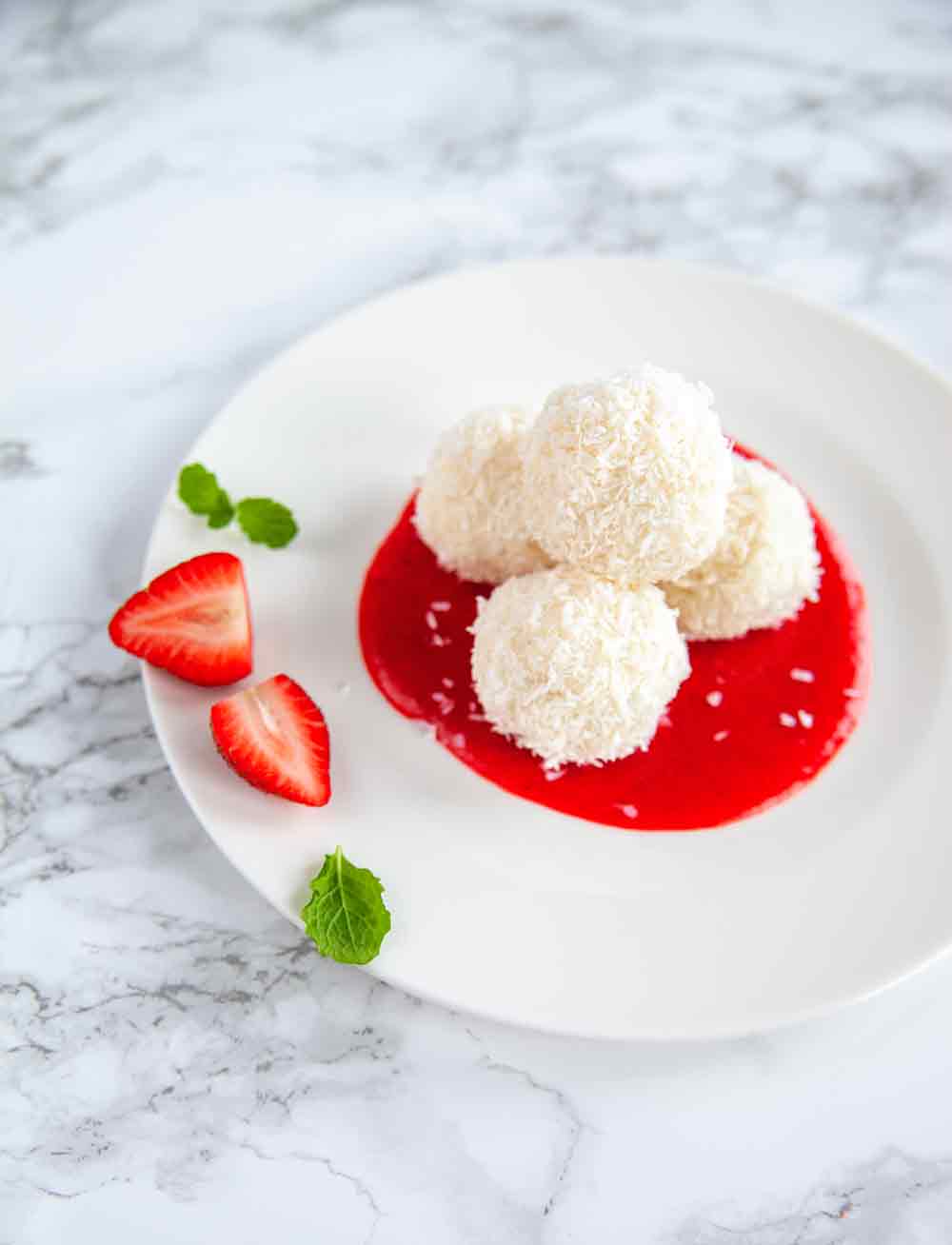 Milchreisbällchen im Kokosmantel mit Erdbeersauce