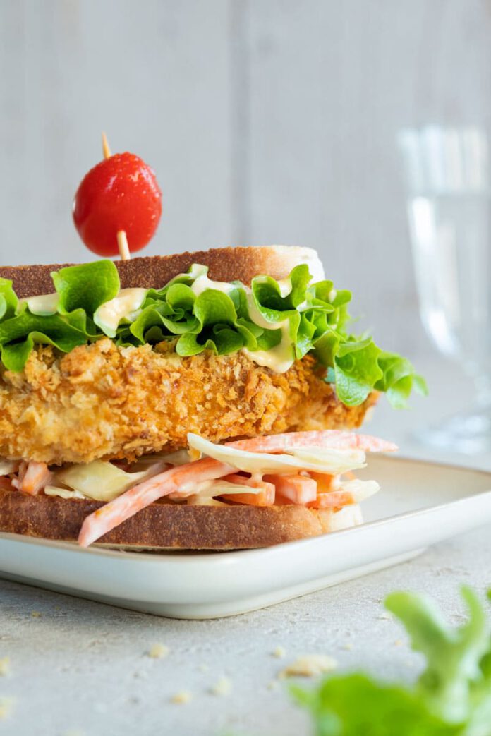 - Eine Scheibe Brot mit reichlich Coleslaw belegen, darauf ein gebackenes Schnitzel und einige Blätter Kopfsalat. Eine weitere Scheibe Toastbrot reichlich mit Sauce bestreichen und auf das fertige Sandwich legen. Guten Appetit.