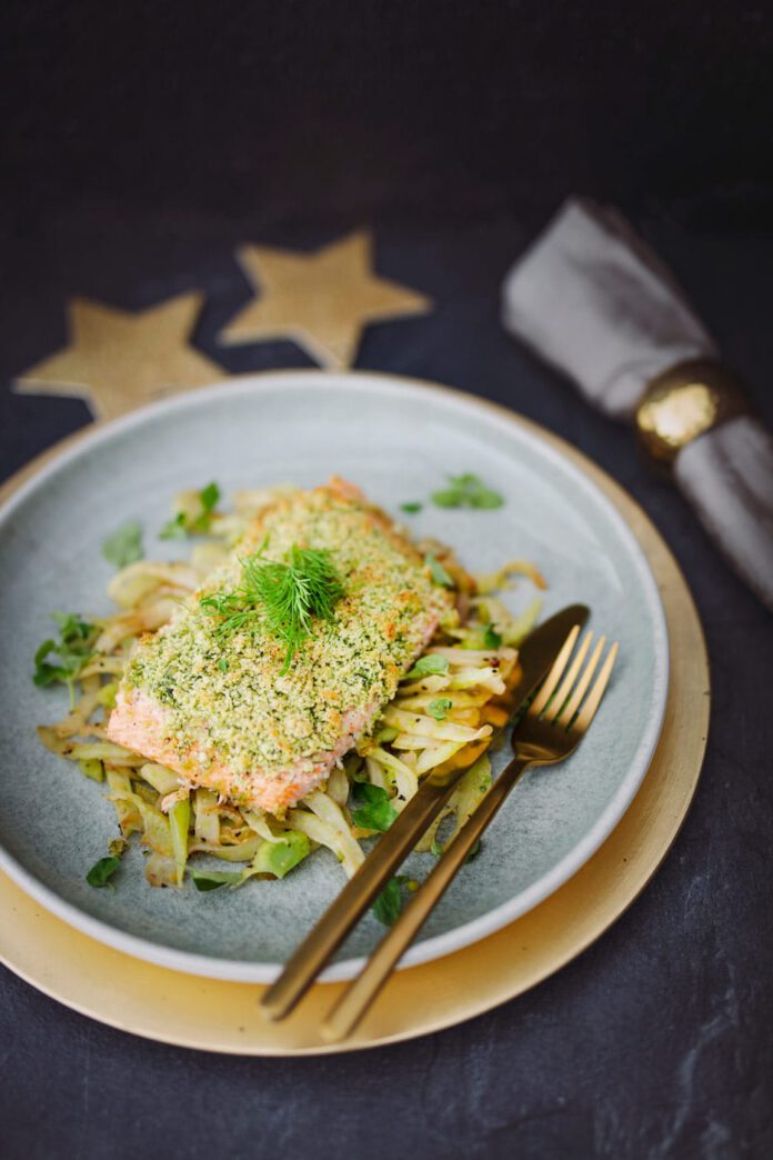 - Die Lachssteaks auf ein mit Backpapier ausgelegtes Backblech legen. Die Oberseite mit einer schönen Schicht Dillbrösel belegen. In den Ofen schieben und 12–15 Minuten backen.