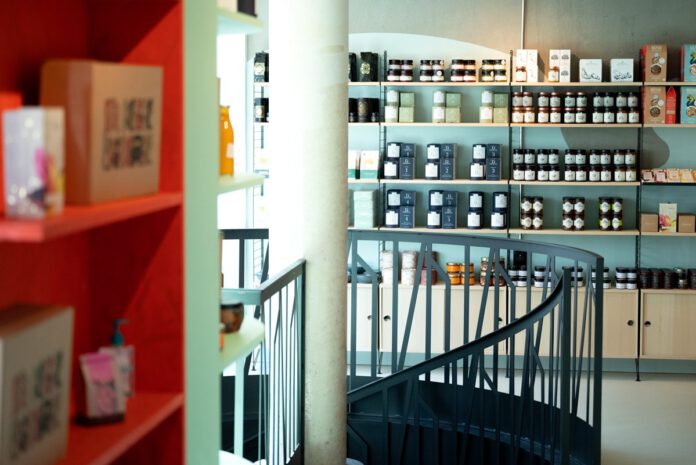 Von außen zieht eine Leuchtreklame mit runden, freundlichen Buchstaben den Blick auf sich, die den Namen des Lokals enthüllt. Sobald man durch die Tür tritt, befindet man sich in einem farbenfrohen Universum in Rot- und Grüntönen. Die Produkte sind sehr schön auf Regalen der Marke String präsentiert. Man bemerkt auch das Bestreben, diesen Ort mit maßgefertigten, geschwungenen Holzmöbeln zu personalisieren, die für noch mehr Pep in den Farben Rot und Grün gestrichen wurden. Die Inneneinrichtung wurde zusammen mit der luxemburgischen Designerin Ruth Lorang entworfen und durchdacht, damit die Gäste Lust bekommen, zu flanieren und sich beim Besuch von ihren Wünschen leiten zu lassen