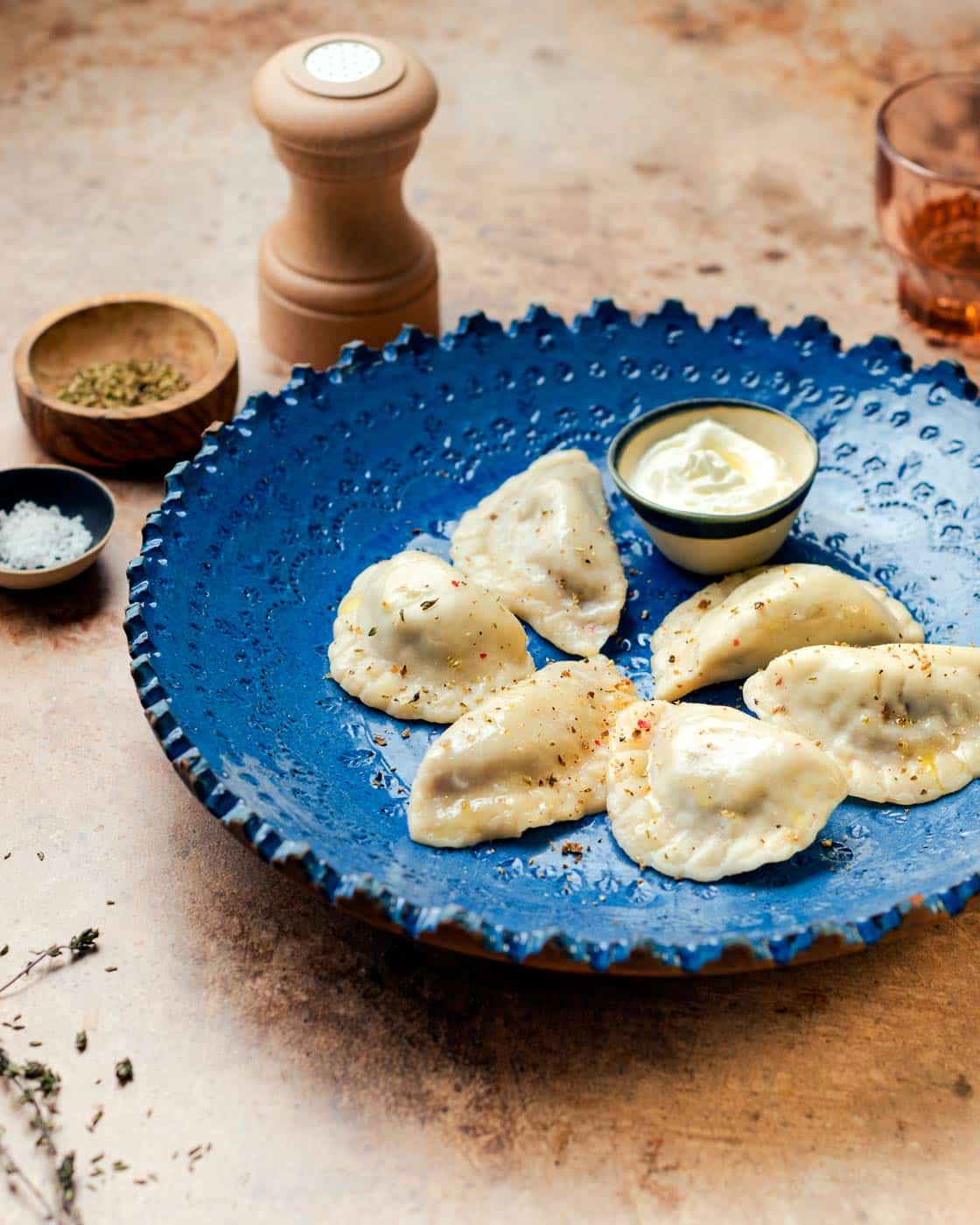 2. Für den Teig: Mit einem Nudelholz etwa 2 mm dick ausrollen. Mit einem Ausstecher oder Glas Kreise ausstechen, etwas Füllung auf jeden Kreis geben und zu Pierogi schließen. Einen großen Topf mit gesalzenem Wasser zum Kochen bringen,