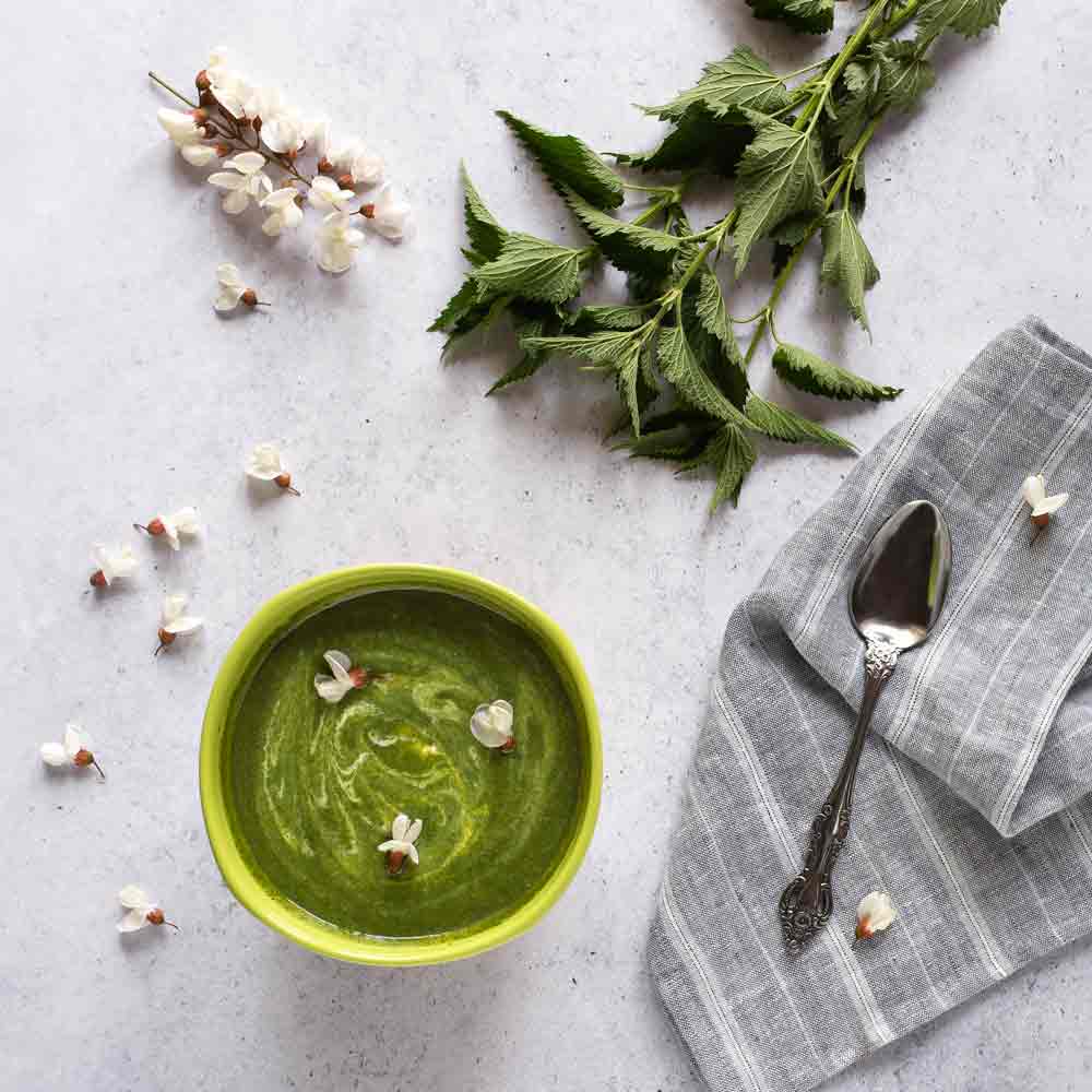 Ein Drittel der Brennnesselblätter fein hacken und beiseitestellen. Rapsöl in einem Suppentopf erhitzen, Zwiebel zugeben und bei schwacher Hitze etwa 5 Minuten glasig dünsten. Kartoffelwürfel beigeben und ebenfalls etwas andünsten. Die restlichen 2â„3 Brennnesselblätter in den Topf geben und 1 Minute garen. Dann mit Fond und Sauerrahm aufgießen, bei schwacher Hitze etwa 10 Minuten köcheln lassen, bis die Kartoffelwürfel gar sind. Die Suppe fein pürieren. Mit Salz und Pfeffer abschmecken. In Suppenteller füllen und mit gehackten Brennnesselblättern und Croûtons bestreuen.