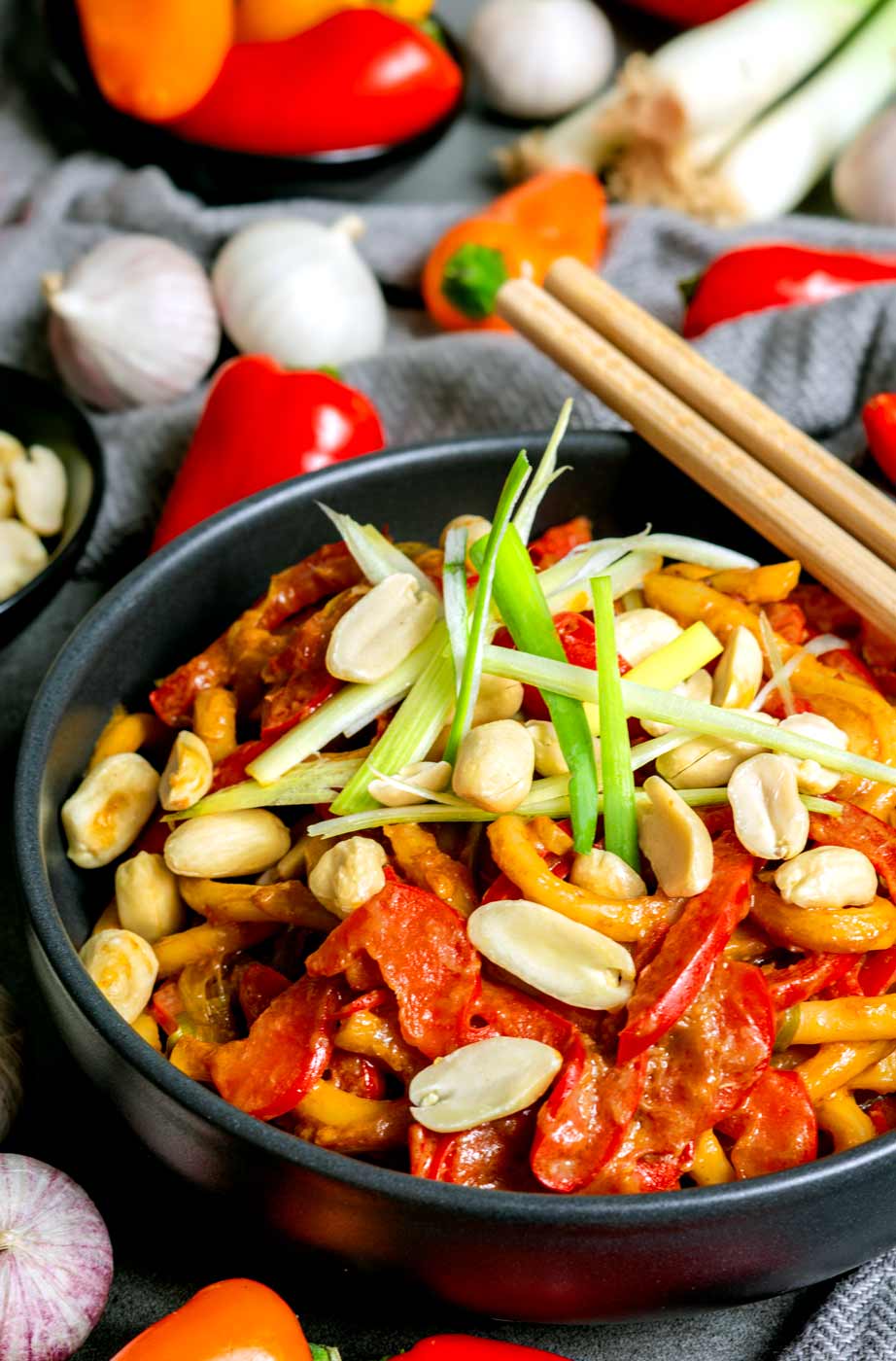 - Mit gehackten Erdnüssen und Frühlingszwiebeln garnieren.