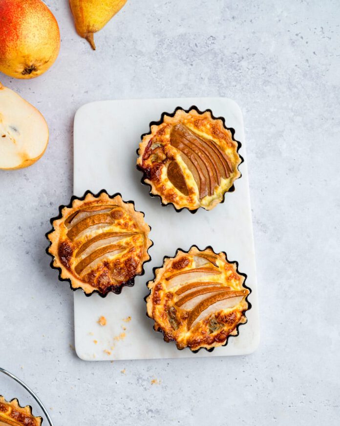 - Die Eimasse in die Förmchen gießen. Die Birnenscheiben darauflegen, dann kleine Stücke Gorgonzola. Die Quiches in den vorgeheizten Ofen bei 180 °C schieben. 45 Minuten, bis die Kruste goldbraun ist, backen.