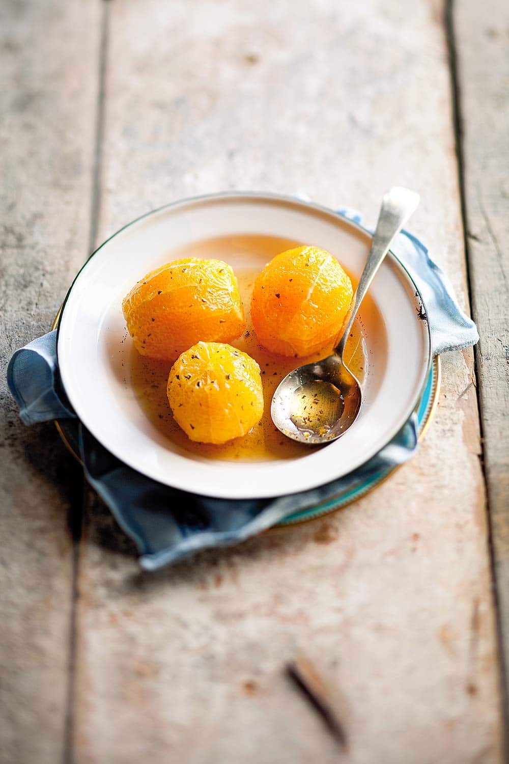 2. Vorsichtig 4 – 6 Orangen schälen, in die Pfanne geben und köcheln lassen, bis sie gar sind und die Flüssigkeit sirupartig geworden ist.