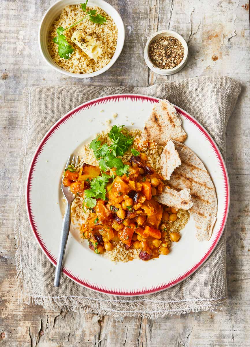 - 1 Den Ofen auf 200 °C Ober-/Unterhitze vorheizen. Ein Backblech mit Backpapier auslegen. Das Gemüse auf das Blech legen und die Hälfte des Öls, die Hälfte des Ras el Hanout, 1 EL kaltes Wasser sowie Salz und Pfeffer hinzufügen. Gut umrühren und 40 Minuten braten, dabei nach der Hälfte der Zeit wenden, bis das Gemüse weich ist.