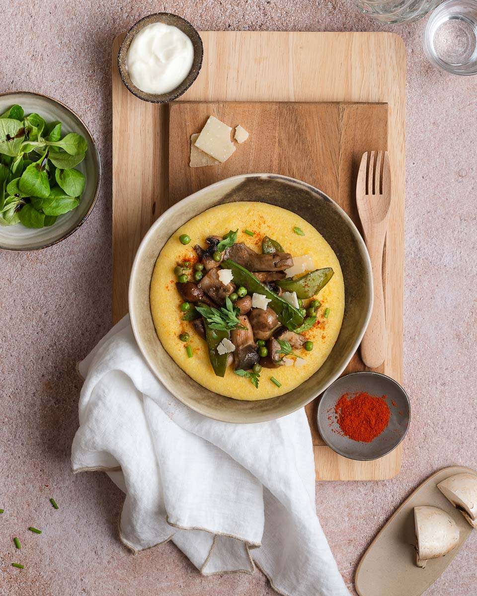 - Pilze, Gemüse und Polenta auf einem Teller anrichten. Mit frischer Petersilie und geriebenem Parmesan servieren.