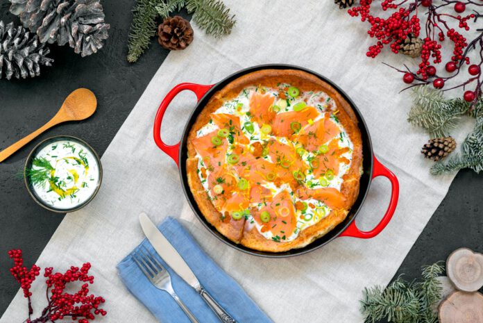 4. Die Frühlingszwiebeln in kleine Ringe schneiden. Sobald das Dutch Baby gebacken und aus dem Ofen ist, die Crème-fraîche-Mischung darauf verteilen, den Lachs und die Frühlingszwiebeln darauf anrichten und nach Belieben mit einigen weiteren frischen Kräutern, der Zitronenschale und Lachsrogen garnieren.