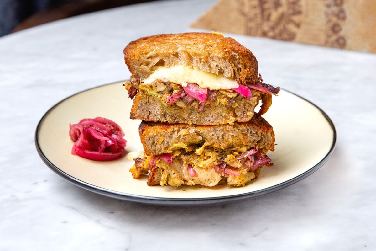 - Die Hähnchenmischung auf einer Scheibe Sauerteigbrot anrichten.