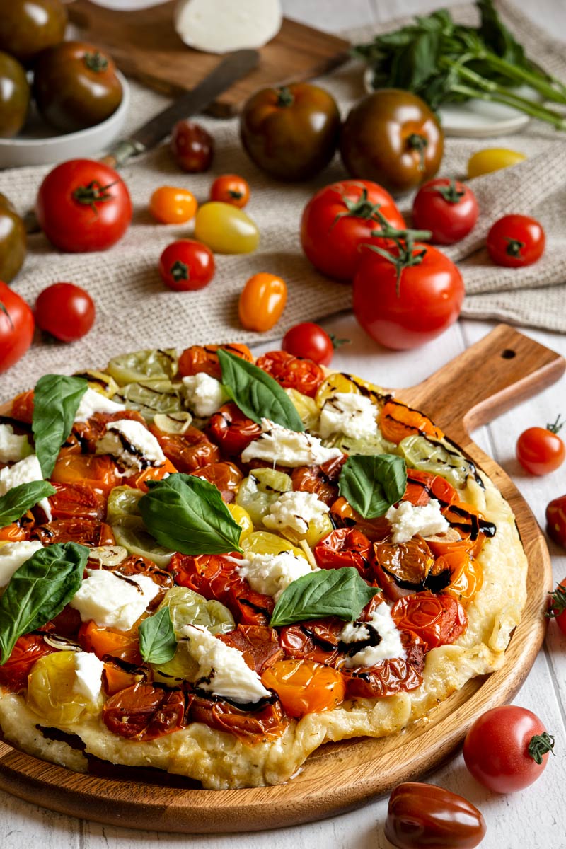 - Die Tarte auf ein großes Brett stürzen (Vorsicht mit dem heißen Saft der Tomaten), mit Mozzarella oder Burrata, frischen Basilikumblättern und Balsamico-Glasur garnieren.