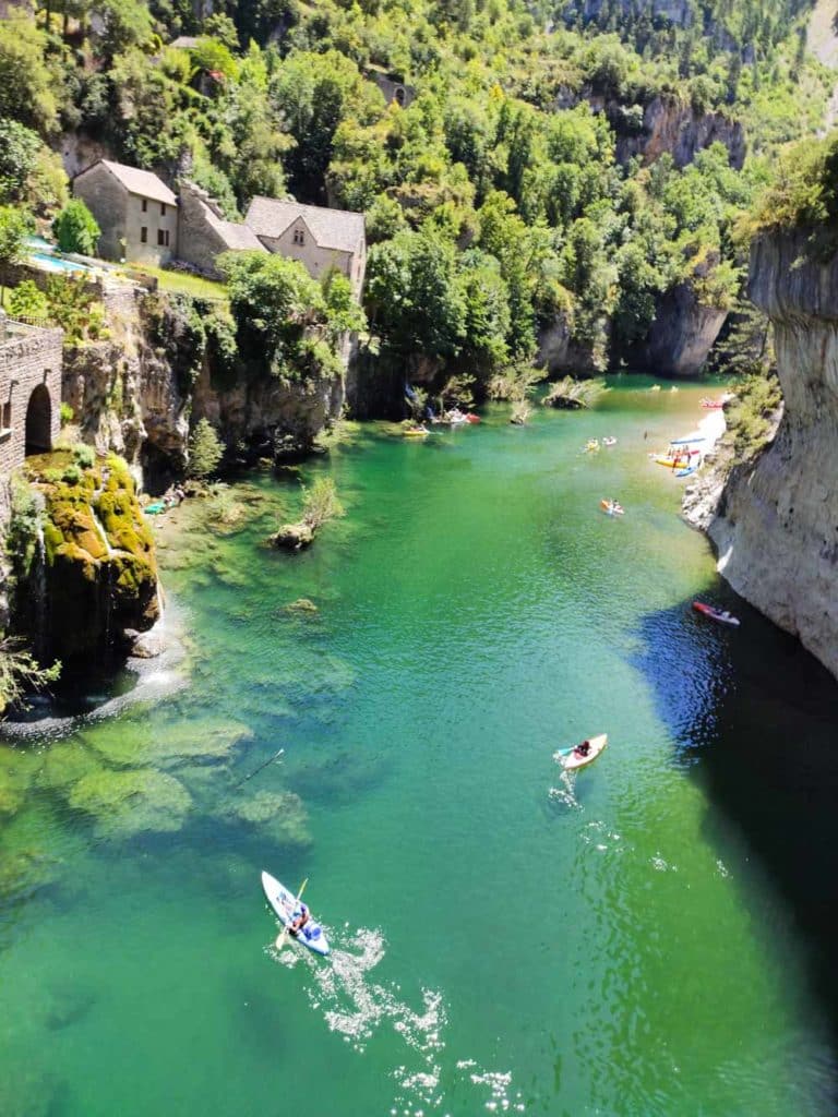 Saint-Chély-du-Tarn unterhalb eines Steilhangs am linken Tarnufer. Die bildschöne, unter einem Felsen erbaute Kapelle Notre-Dame-de-Cénaret mit ihrem Schiff aus dem 12. Jahrhundert bildet den Eingang zu einer Höhle.