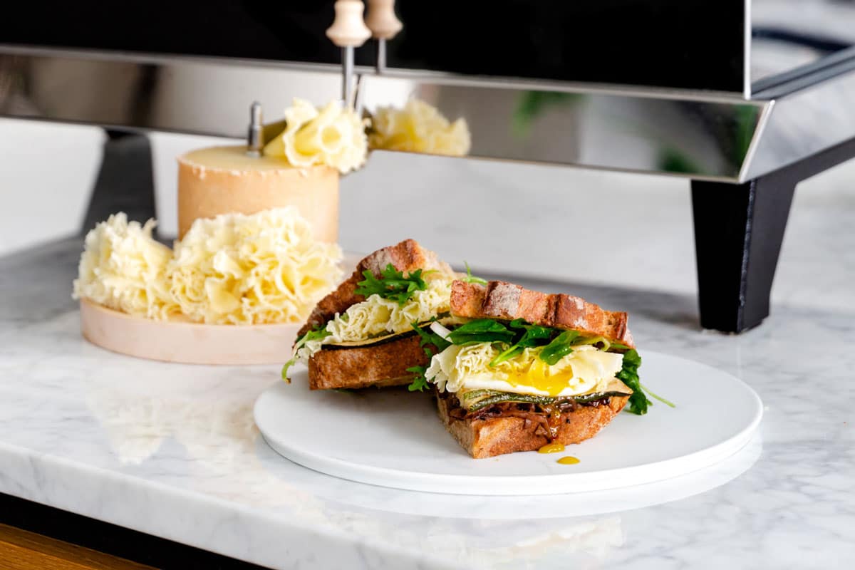 - Das Ei mit 80 g Tête de Moine g.U. bestreuen. Den Salat dazugeben und den Croque schließen. Wir fügen den Käse nicht vor dem Backen hinzu, da er im kalten Zustand eine schöne pfeffrige Note hat. Sie können ihn aber auch schmelzen lassen.