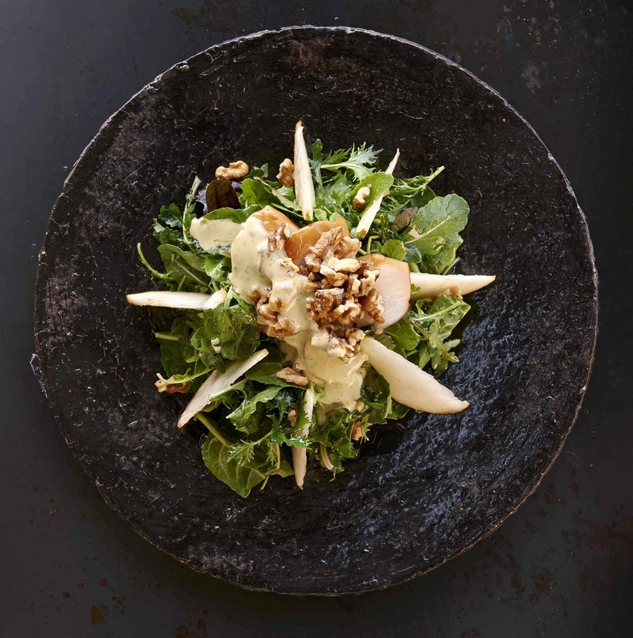- 4 Handvoll herbstliche Blattsalate, z. B. Grünkohl, Mizuna, wilder Rucola, Endivie, Baby-Leaf-Mischung