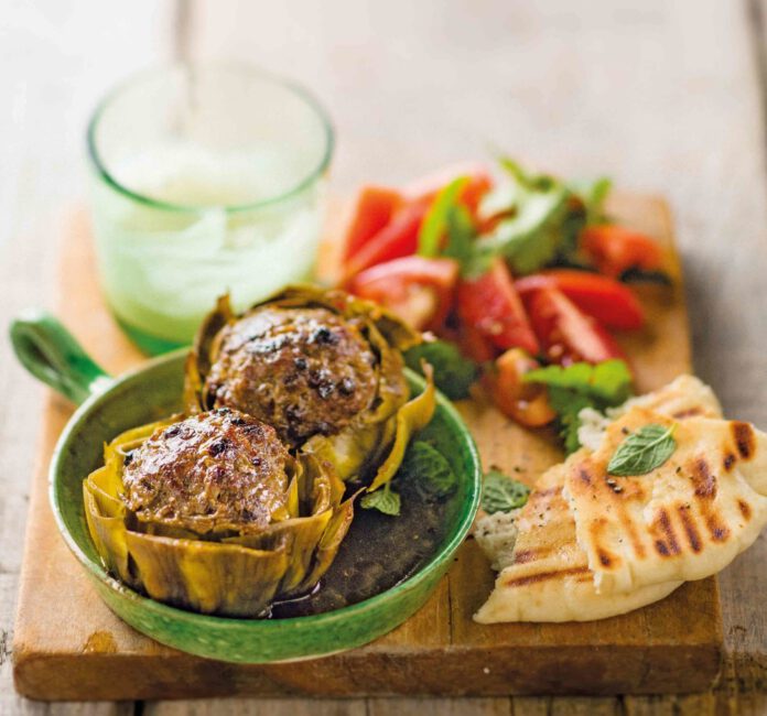 4. Clean the artichokes, removing the outer leaves and generously trimming off the upper third with the tips. Remove the stalk. Hollow out the artichokes and fill with the ground meat mix.