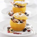2. Roughly chop the pistachios, pine nuts and mixed nuts. Combine with marzipan, egg yolks and cream. Fold in the raisins and cranberries. Fill the hollowed apples with the mixture.