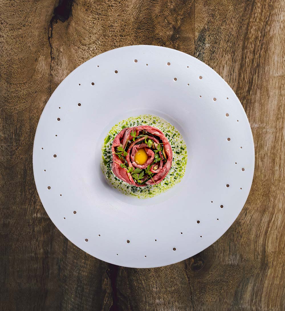 Salt the meat and cook it sous-vide in a boil-proof plastic bag for 3 hours at 60 – 65°C in a water bath. Remove and leave to cool. Ideally, prepare the meat the day before. Before serving, cut the meat into very thin slices using a slicer.