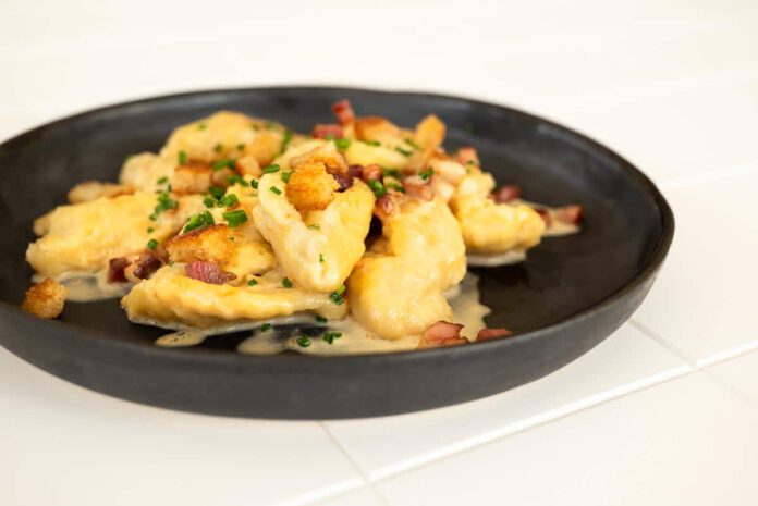 1. Coat the kniddelen with the sauce and bacon. Sprinkle with croutons and minced chives. Serve piping hot.