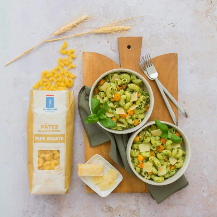 - Drain and toss the pasta with the pesto and roasted butternut. Distribute between 4 plates, sprinkle with the toasted pine nuts and parmesan shavings and serve.