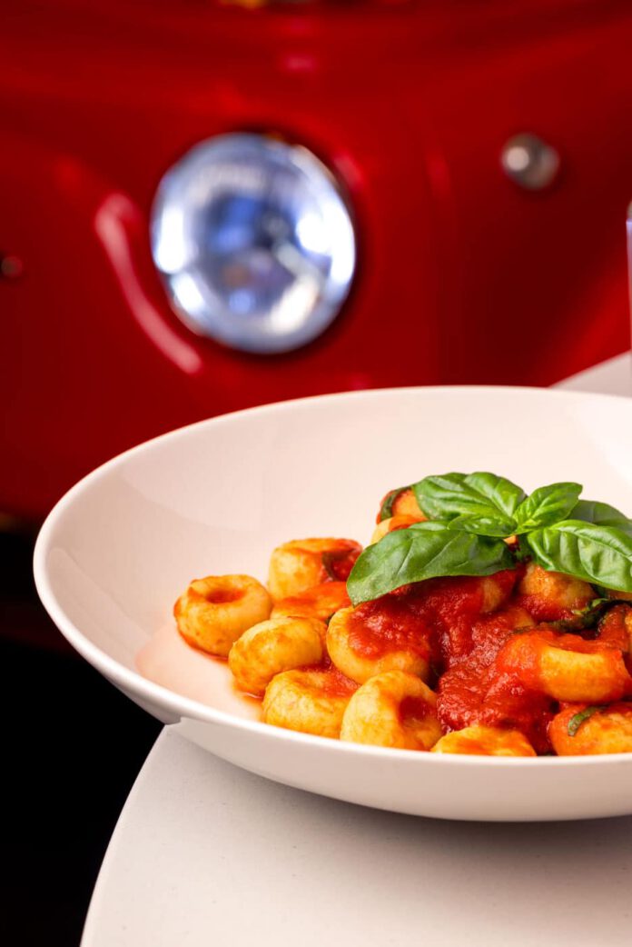 - Mix the gnocchi with the tomato coulis, add a drizzle of extra virgin olive oil, and sprinkle with Parmigiano Reggiano aged over 30 months.